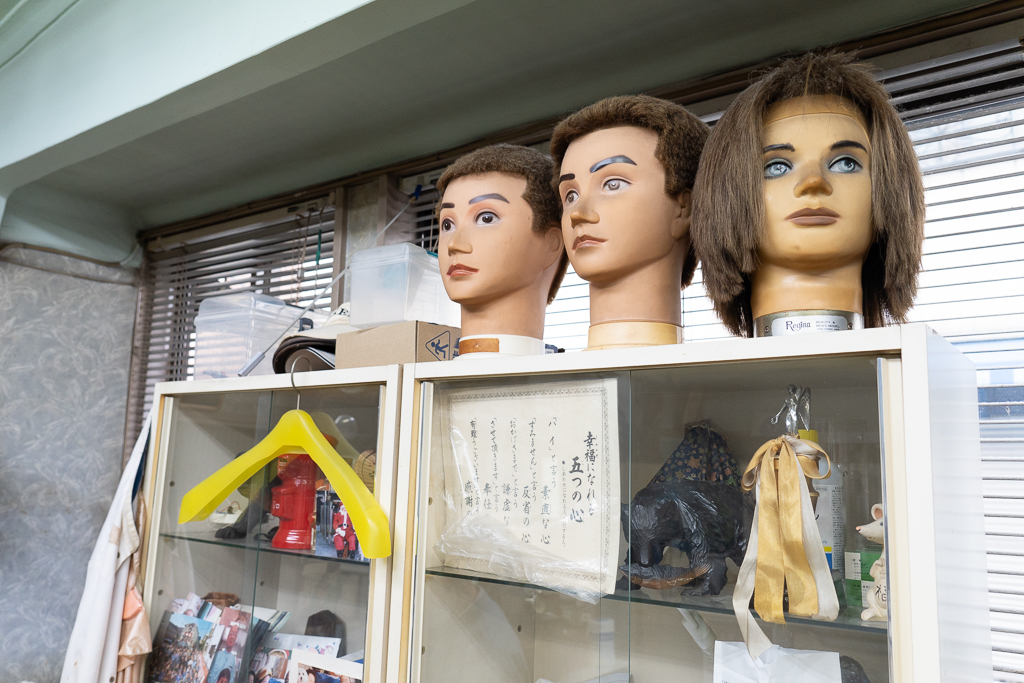 店内に入ると、そこはもう完全に別の時間が流れている。 ガラスケースに並んだ整髪料、少し色あせたポスター、そして、どこか虚空を見つめるマネキンたち。 かつては最新の流行ヘアスタイルを提示していた彼らも、いまはこの店の静寂を見守るオブジェのようだ。
