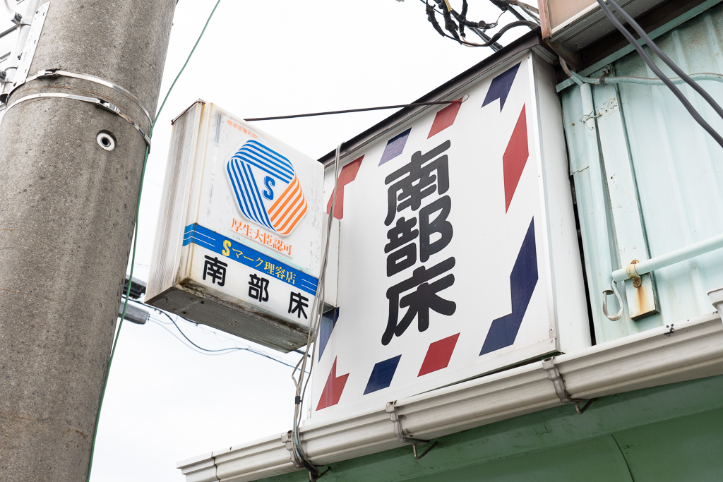 かつては平屋だった建物を建て替えた際、富一さんがデザインしたという看板。トリコロールが鮮やかだが、側面にはしっかりと「理容床」の文字が残る。ここはいまも「床」なのだ。