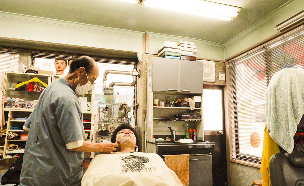 至福のシェービングタイム。蒸しタオルの熱さと、カミソリの冷たさが交互に肌を撫でる。美容室では味わえない、理容室だけの特権だ。